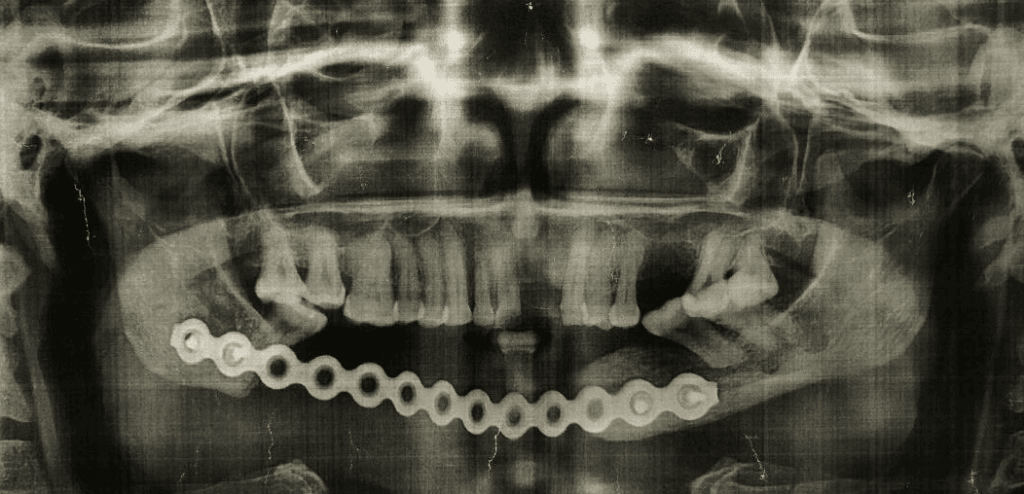 Pour cette première (à la fois en Guinée et à la fois par Enfants Du Noma), le cas a été bien choisi, sans comorbidité associée, et de façon à ne pas être confronté à des soucis de dénutrition ou d’anémie. Il s’agissait d’une patiente guinéenne de 42 ans, qui avait déjà bénéficié à Conakry il y a un an de l’exérèse d’un très volumineux améloblastome (tumeur bénigne) de la mandibule par le Pr Rahiou Diallo. La perte de substance osseuse avait été maintenue par une plaque métallique, mais sans apport osseux. Cette plaque avait fini par s’exposer dans la bouche de la patiente, et il fallait donc recourir à une reconstruction osseuse.