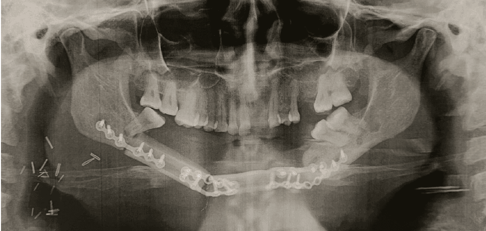 L’intervention a consisté en le prélèvement du péroné droit (fibula) de la patiente, avec de la peau de la jambe pour reconstruire la peau du menton, et surtout avec son artère et ses veines qui ont été « rebranchés » (micro-anastomoses) sous microscope à des vaisseaux au niveau du cou, pour que tous ces tissus soient revascularisés. Il a fallu 2 morceaux de péroné pour reconstruire la forme de la mâchoire, un pour le menton, et l’autre pour la branche horizontale droite.